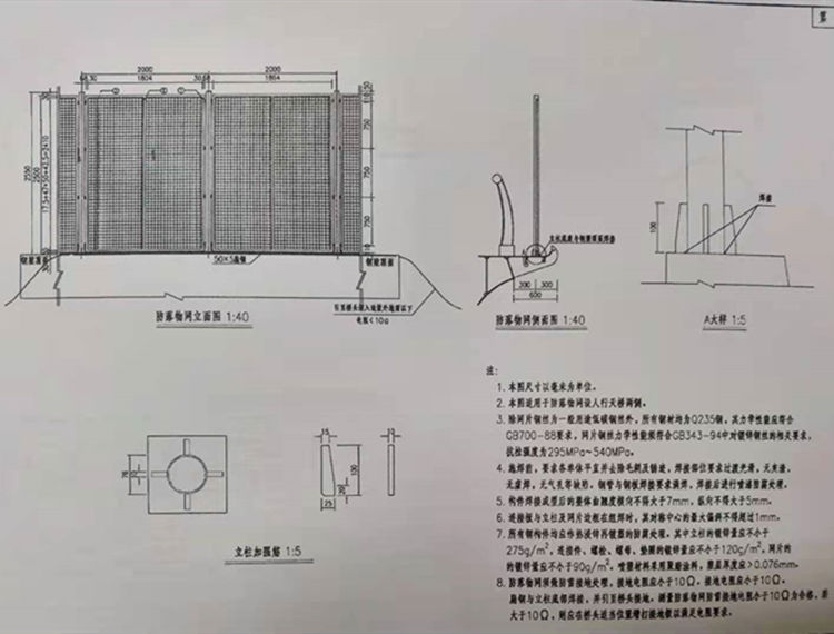 3.防落物网除网片钢丝为一般用途低碳钢丝外,所有钢材均为Q235钢,其力学性能应符合GB700-88要求,网片钢丝力学性能须符合GB343-94中对镀锌钢丝的相关要求,抗拉强度为295MPa~ 540MPa。