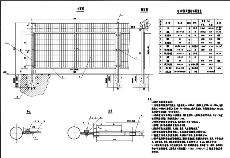 3、焊接网隔离栅基础部分根据各地区地质地貌的结构和复杂程度的差异,施工的过程中要针对不同地质状况实施专业技术,基础部分根据实际情况,一般地质如粉土,沙土等,地基承载力<300KPa,采用300×300×1000 的基础,以达到其基础的稳定;特殊地质如山区段,地基承载力≥300KPa,采用300×300×500 的基础。说明中焊接网隔离栅样式及参数仅为推荐,不作为指定样式,施工选取焊接网隔离栅时,焊接网隔离栅立柱、横梁、孔径等不得低于本图提供参数,且需满足《隔离栅》(GB/T 26941-2011)规范中相关参数要求。