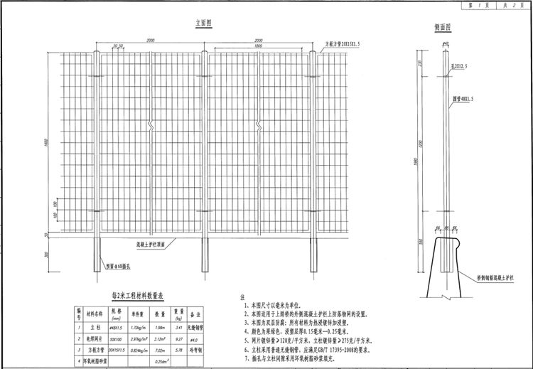 支线上跨桥外侧混凝土护栏或梁柱式钢护栏上均应设置防落物网,防落物网所有材料热浸镀锌加浸塑,网片镀锌量120g/㎡,网片浸塑层厚度150μm,立柱镀锌量275g/㎡,立柱浸塑层厚度250μm。立柱采用普通无缝钢管,混凝土护栏顶部预留立柱插孔,预留孔的垂直度偏差不超出1%,预留孔与立柱间隙采用环氧树脂砂浆填充。同时,防落物网应做好防雷接地处理,接地电阻应小于10Ω。