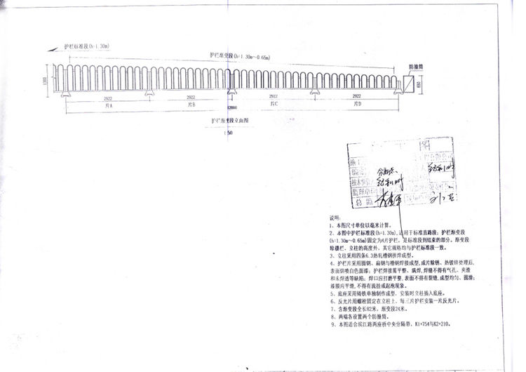 2、本图中京式道路护栏标准段(h=1.30m),适用于标准直路段;京式道路护栏渐变段(h=1.30m~0.65m)固定为4片护栏,是标准段到结束的部分。渐变段除栅栏、立柱的高度外,其它规格均与护栏标准段一致。