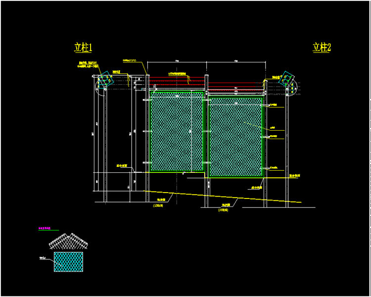 围网采用金属菱型网状钢管架,钢管高度不低于2.5m,直径不小于70mm,金属菱型网高2.2m,宽1.5m,网丝直径不小于5mm,网眼见方不大于0.0025平方米,上部刺丝网每极间距100mm。