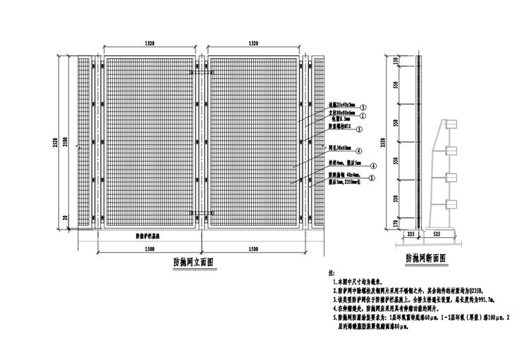 2.防护网中除螺栓采用不锈钢之外,其余构件的材质均为Q235B。