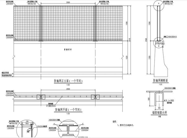 5.立柱与防抛网可在工厂焊接成网片,防抛网与顶部、中部、底部角钢立柱采用Φ12钢筋抱箍固定,横向间距为225mm。