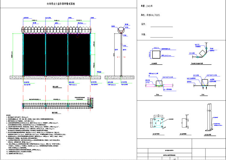 1、防攀爬警戒围墙图中所标注尺寸为中心线尺寸,单位为mm计。