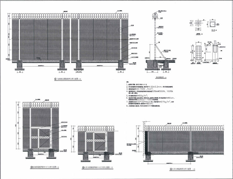7、周边隔离网立柱为100*100*4mm方柱,方通含锌量不小于275g/m2,立柱外表面热镀锌并喷涂聚酯处理,喷涂厚度不少于80um。
