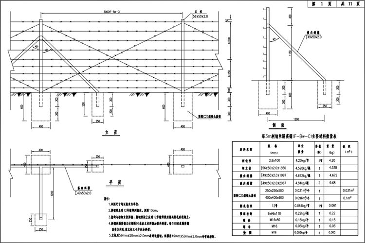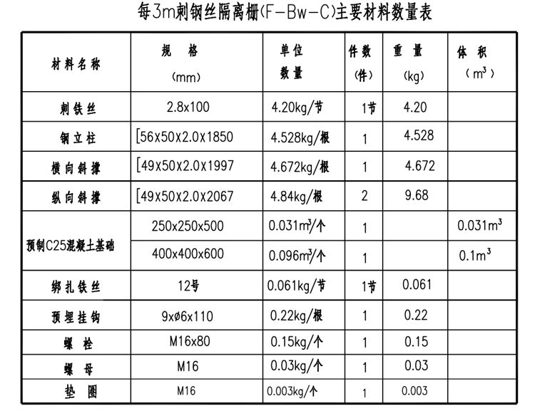 本图尺寸均以毫米为单位。刺钢丝采用12号镀锌刺钢丝,刺距10cm。挂钩与槽钢立柱焊接,刺钢丝拉上后用12号镀锌铁丝将其绑扎在铁钩上。刺钢丝隔离栅立柱每隔99米在立柱两侧加纵向斜撑,每198米或隔离栅改变方向处在立柱三个方向加斜撑。立柱用56mmx50mmx2.0mm冷弯边槽钢,斜撐用49mmx50mmx2.0mm冷弯边槽钢。剌钢丝隔离栅立柱采用56×50×2.0×1850槽钢热镀锌喷塑防腐处理,钢构件镀锌量为275g/㎡,涂塑层厚度大于76μm。立柱安装间距设置为3m。刺钢丝采用12号镀锌钢丝,刺钢丝镀锌量为120g/㎡。刺丝间距4×15+4×20?;』炷廖?C30,尺寸400×400×600。按新规范增加隔离栅小门。所有钢构件均应进行热浸镀锌涂塑处理,螺栓、螺母、垫圈等连接件的镀锌量为120g/㎡,其它构件为 275g/㎡,网片塑层厚度不小于0.3mm。其它钢构件涂塑层厚度不小于76μm。