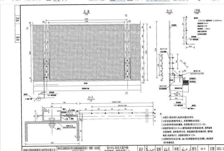 1.本图尺寸除注明外其余均以毫米为单位。2.立柱安装在桥梁护栏座上,用预埋螺栓加以固定。3.立柱采用冷弯内卷边槽钢,其质量应符合GB/6723-86。4.桥梁护网采用40x4mm镀锌扁钢进行防雷接地处理,镀锌扁钢与防落物网、波形梁护栏立柱、面板接触位置应绝缘处理,镀锌扁钢埋入地面线以下,其接地电阻应≥10欧姆。5.本图护栏形式仅为示意,施工时应根据钢护栏适当调整,顺适钢护栏外轮廓线型。6.立柱采用冷弯内卷边槽钢20*50*100*3.0mm;边框采用方管50*3.0mm;网片焊接网50*50*3.0mm。
