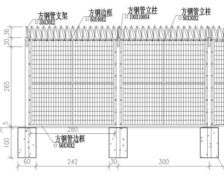 1、防护栅栏型式采用3.0m高,混凝土基础型钢立柱, 浸塑网片栅栏。即由钢丝网片(60x30x4)焊接在钢边框上,钢边框通过防盗螺栓固定在钢立柱上。