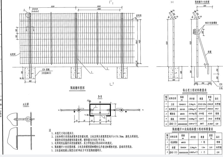 安徽亳州高速公路隔离栅生产厂家1、本图尺寸均以毫米计。2、立柱和网片采用热浸塑单层防腐处理,立柱及网片浸塑厚度均不小于0.38mm,颜色为果绿色。紧固件采用热浸镀锌防腐处理, 镀锌量为350克/平方米。3、电焊网用金属丝采用低碳钢丝,其力学性能应符合GB343的规定。4、隔离栅开口处设置斜撑,立柱及斜撑预留M8螺栓孔并通过M6螺栓连接,基础采用现浇。5、立柱基础混凝土强度达到70%后方可安装隔离栅网片。