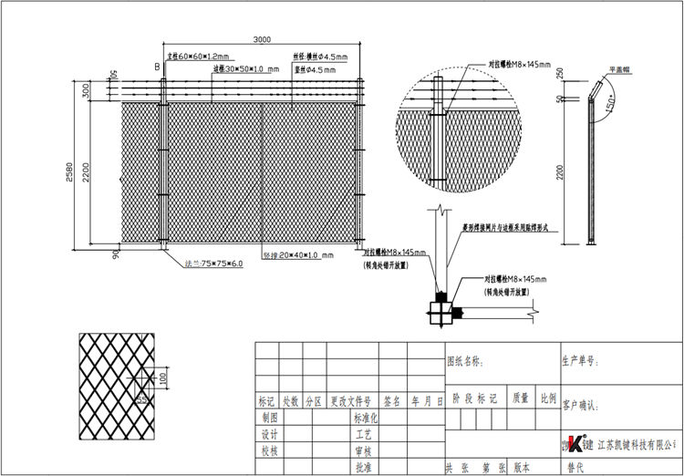 2、保税区围网网片采用斜方孔网电焊网片款式,网孔对角线间距55*100mm;