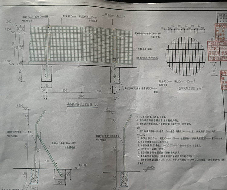 5、沿路铁丝网围栏铁丝直径2.5mm,网孔50mmx100mm,涂刷防锈漆;边框四周采用宽30mmx厚2.0mm钢板;竖筋为钢板宽30mmx厚2.0mm。