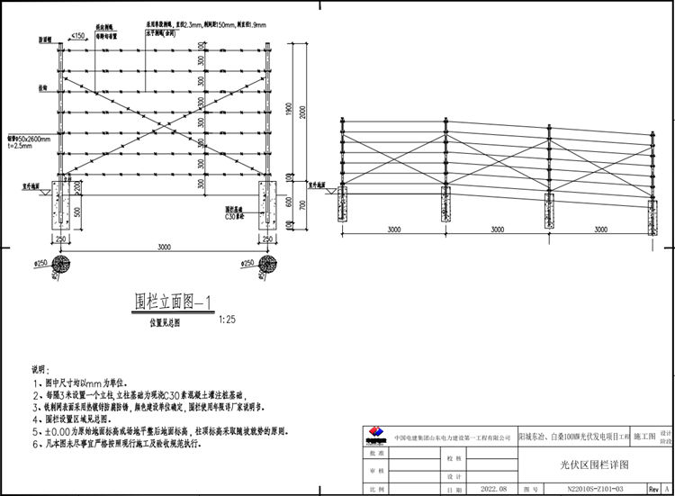 2、刺丝围栏每隔3米设置一个立柱,立柱基础为现浇C30素混凝土灌注桩基础。