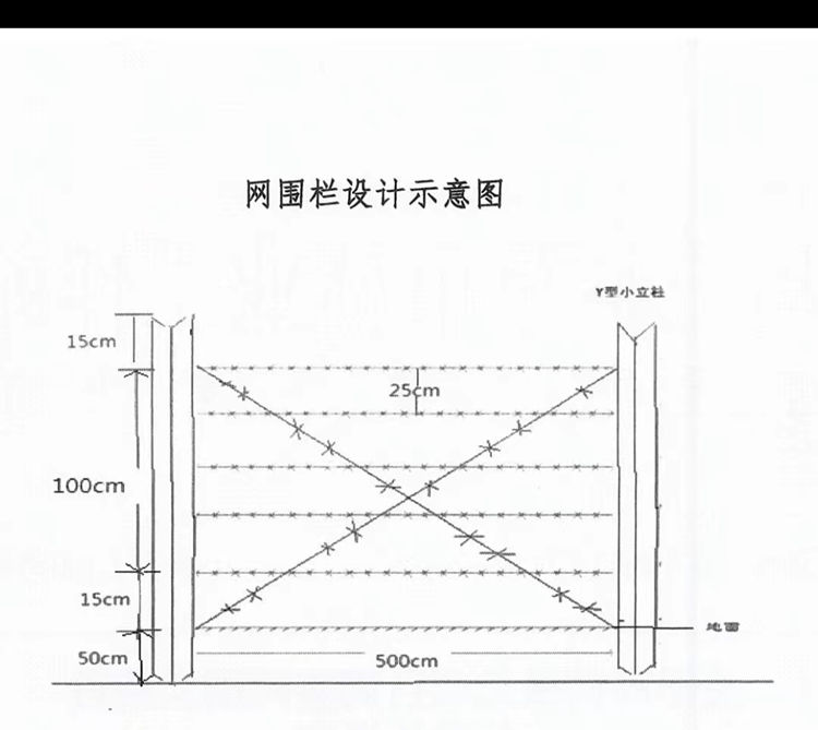 2、镀锌刺铁丝防护栏使用七道刺丝(刺丝规格为带刺双丝合一,镀锌铁丝,单丝2.4mm,双丝4.8mm),其中五道横丝,两道X丝。刺间距小于6cm。 (见镀锌刺铁丝防护栏设计示意图)