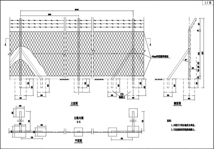 1.本图编织网隔离栅尺寸均以毫米为单位。