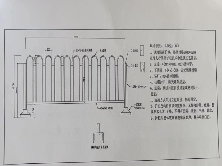 1、市政道路人行隔离护栏整体规格3000*1200。