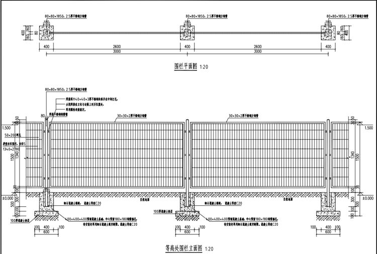 1.隔离护栏立柱为80mm*80mm*1850mm,2.5mm厚方钢管;隔离护栏基础为预制混凝土,混凝土等级为C20 ,规格400mm*400mm*400mm。隔离护栏基础中心预留180mm米180mm钢管插孔,钢管深入混凝土基础300mm , 待安装好再用细石混凝土(混凝土等级为C20 )填实缝隙。