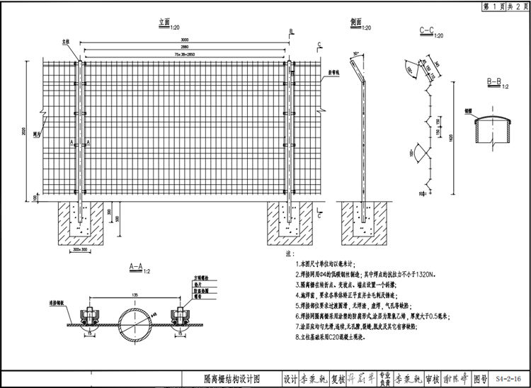 8.涂塑防护网立柱基础采用C20混凝土现浇。