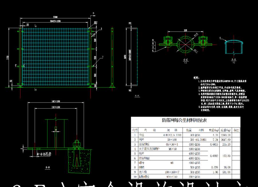 锌量:网片为每平方米90克,立柱横梁等为每平方米270克,第二层涂层为聚氯乙烯,厚度不小于0.3毫米。