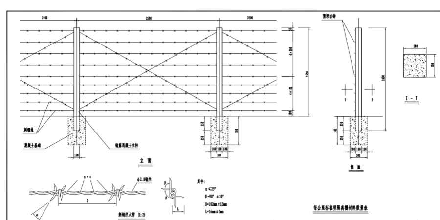 2.直线段每隔20m设置砼基础Ⅱ (300x 400 x 500);每隔50m设置砼基?、?(400x 400 x 500);每隔100m设置砼基础IV (400x500x600)。