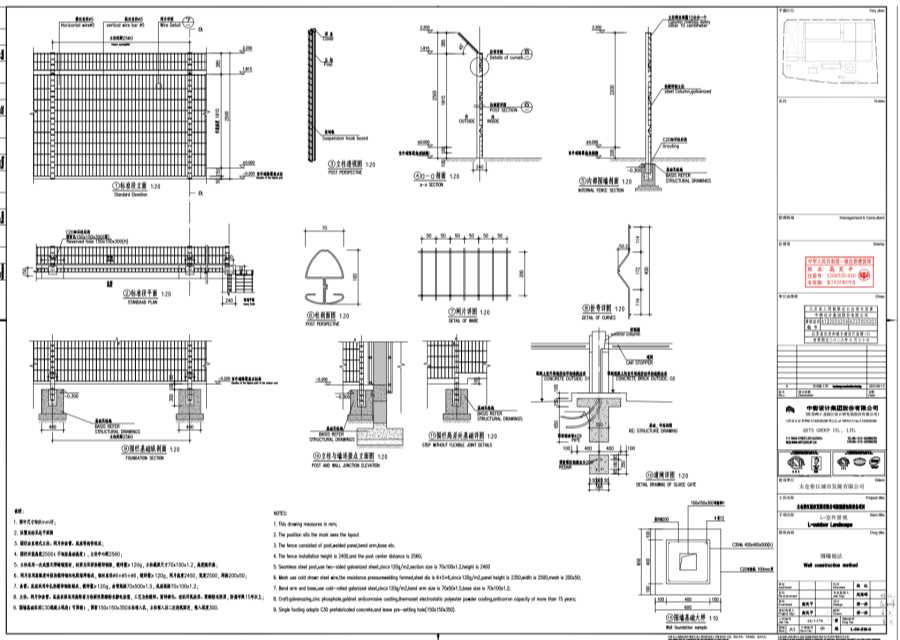 3.围栏由直埋式立柱、网片和曲臂、底座等构件组成。